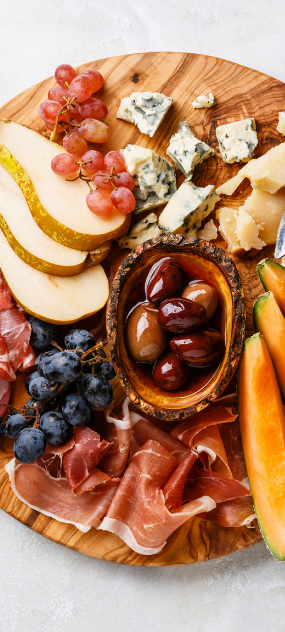 2. Aseta alustan keskelle oliivit pienessä astiassa. Tämän jälkeen asettele alustalle juustokuutiot ja parmankinkku haluamallasi tavalla. Täytä raot hedelmillä ja keksitikuilla. Voit halutessasi lorauttaa laadukasta balsamicoa parmesaanijuustokuutioiden päälle.